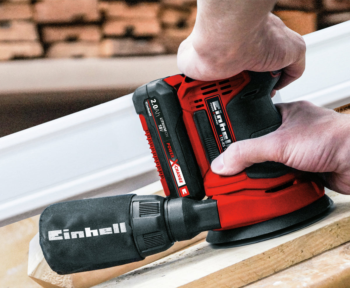 Der Einhell Akku-Exzenterschleifer TE-RS 18 Li - Solo macht den Anwender in Heim, Garage und Werkstatt flexibel, kabellos und unabhängig. Der Akku-Exzenterschleifer ist Mitglied der Power X-Change-Familie. Die Akkus mit den hochwertigen Lithium-Ionen Akkuzellen können bei allen Mitgliedern der Power X-Change Familie angewendet werden. Ob weiche oder kompakte Materialien: durch die Drehzahl-Elektronik lässt sich das Werkzeug für ein material- und anwendungsgerechtes Arbeiten an die zu bearbeitenden Oberflächen anpassen, ob nun Holz, Metalle oder steinartige Strukturen. So ist feinster Schliff bei hoher Schleifleistung dank des Exzenterprinzips möglich. Sicheres und angenehmes Arbeiten ermöglicht der Softgrip. Festen Halt des Schleifpapiers gewährt die Mikro-Kletthaftung, die einen Austausch im Handumdrehen erlaubt. Damit der Arbeitsplatz sauber und staubfrei bleibt, ist eine Staubabsaugung integriert und auch der Anschluss einer externen Staubabsaugung möglich. Zum Lieferumfang gehört ein Schleifpaper (P80). Akku und Ladegerät sind separat erhältlich.