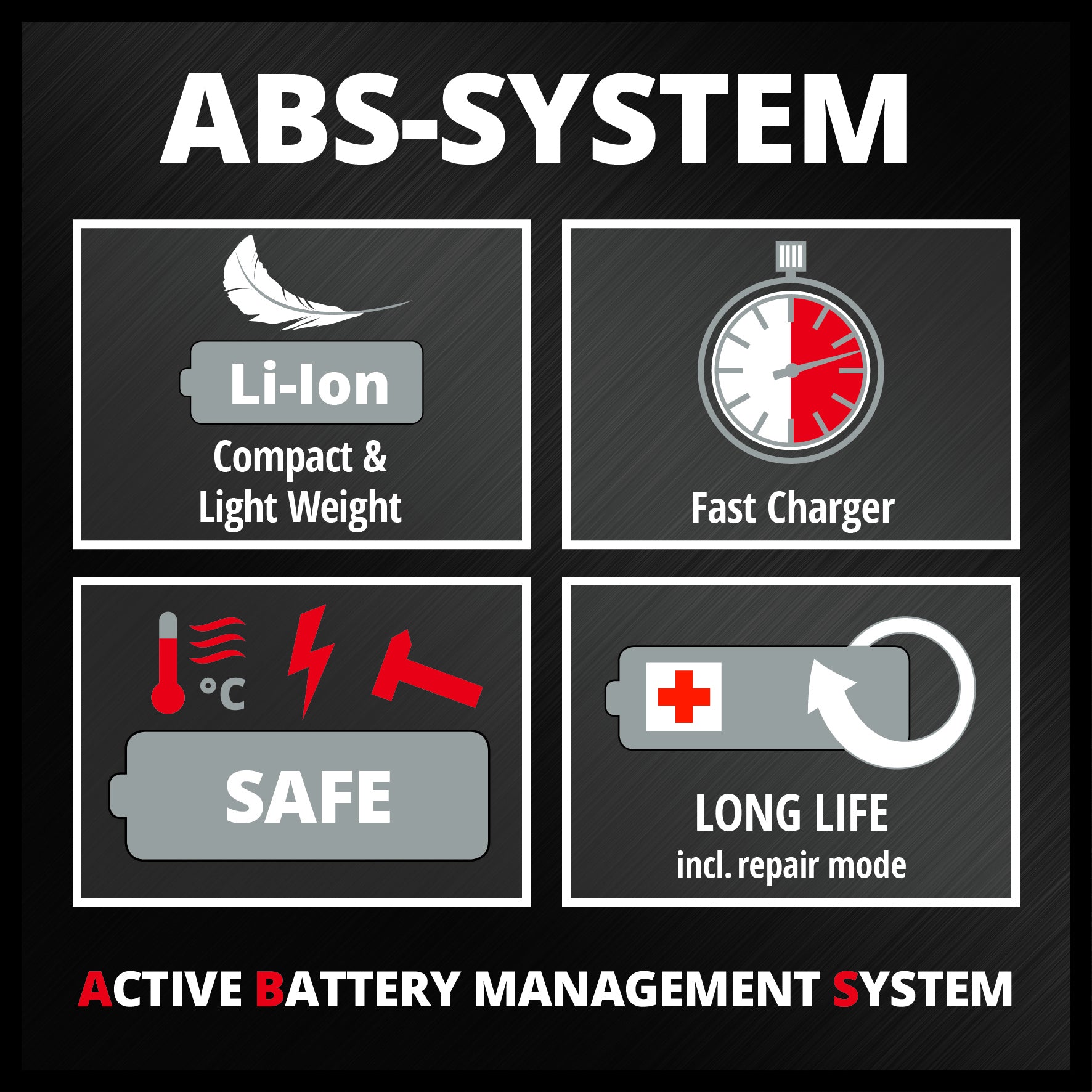 Die 2x 18V 4,0 Ah Power X-Change Akkus gehören zum multifunktionalen und grenzenlos untereinander kombinierbaren Akkusystem Power X-Change von Einhell. Die universell einsetzbaren Power X-Change-Akkus versorgen alle Akkugeräte der gesamten Produktfamilie im Garten- und Werkstattbereich mit Kraft und Ausdauer. Die Vorteile für den Kunden liegen auf der Hand: Mit einem Akku und einem Ladegerät für alle Geräte spart man nicht nur bei der Anschaffung erhebliche Kosten, die universelle Einsatzmöglichkeit schont die Umwelt und bietet gleichzeitig Flexibilität in Haus und Garten. Auch gibt es keine Unordnung und kein Chaos mit unterschiedlichsten Akkus und Ladegeräten für jedes einzelne Gerät. Der 18V 4,0 Ah Power X-Change ist ein Basic-Akku der Power X-Change-Familie und auch geeignet für den TWIN-PACK Einsatz bei 36V-Anwendungen. Mit zwei 4,0Ah Akkus als TWIN-PACK kann man länger arbeiten und die Geräte können mit mehr Power (2x 18V = 36V) versorgt werden. Das prozessgesteuerte, aktive Batteriemanagementsystem ABS überwacht mithilfe des eingesetzten Mikroprozessors stetig die Parameter des Akkus. Dadurch sorgt es für höchste Sicherheit, optimale Geräteperformance, maximale Laufzeit und maximale Lebensdauer. Der aktuelle Ladezustand kann durch eine 3-stufige LED-Anzeige kontrolliert werden. Das Gehäuse widersteht aufgrund der Bauweise Staub, Korrosion und mechanischen Einflüssen. Die Gummierung verleiht dem Akku hohen Stoßschutz und eine gute Griffigkeit. Mithilfe der Griffmulde kann dieser wieder leicht aus allen Geräten entfernt werden.