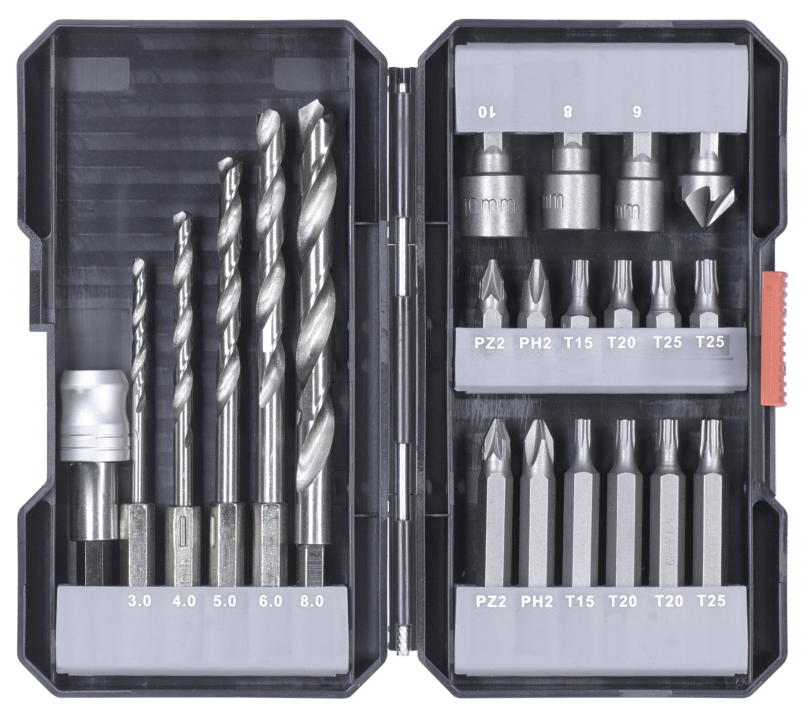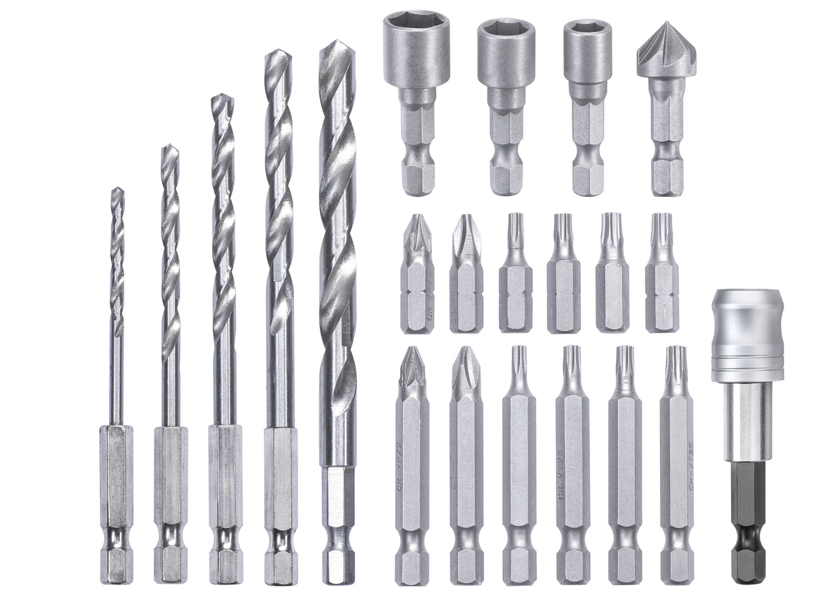 Set Bestehend Aus: Bit-Ausführungen in 25 mm: PH2, PZ2, T15, T20 und T25, Bit-Ausführungen in 50 mm: PH2, PZ2, T15, T20 und T25, Metallbohrer in Ø 3, 4, 5, 6 und 8 mm, aus HSS, mit 118°-Spitze, 3x Steckschlüsseleinsätze, 1x Senker, 1x Schnellwechselbithalter