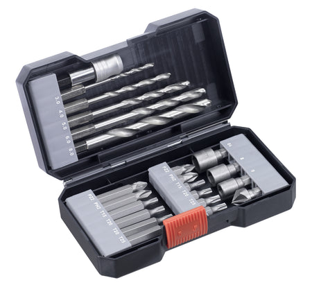 Bit Bohrer Set 22-tlg. mit 12 Bits in den gängigsten Größen und Formen: 6 Bits in 25 mm, 6 Bits in 50 mm, plus 5 Metallbohrer, 3 Steckschlüsseleinsätze, 1 Senker und 1 Schnellwechselbithalter; Bit-Ausführungen in 25 mm: PH2, PZ2, T15, T20 und T25; Bit-Ausführungen in 50 mm: PH2, PZ2, T15, T20 und T25, zum Erreichen auch tiefer liegender Schrauben; besonders wichtige Bit-Abtriebsformen teilweise mehrfach platziert, alle Bits aus CR-V; Metallbohrer in Ø 3, 4, 5, 6 und 8 mm, aus HSS, mit 118°-Spitze; Steckschlüsseleinsätze zum Verschrauben von Muttern, Senker zum bündigen Versenken von Schrauben, aus CR-V, alle Bits und Bohrer mit E6.3-Schaft passend für alle handelsüblichen Bohrmaschinen und Akkuschrauber, Set in S-Box.