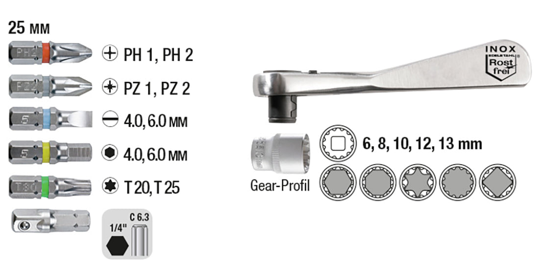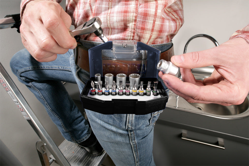 Bit-Box, 17-tlg., Industriequalität, TQ 60, Bits und Stecknüsse, Bits: Antrieb 1/4" Sechskant nach ISO 1173, C 6.3, mit Farbkennringen, zur Unterscheidung der Kopfform, Stecknüsse CV, mit Gear-Profil, für alle gängigen Schraubenkopfformen, Edelstahl Umschaltknarre mit 1/4" Sechskantaufnahme nach ISO 1173, Box aus stabilem Kunststoff mit praktischem Gürtelclip.