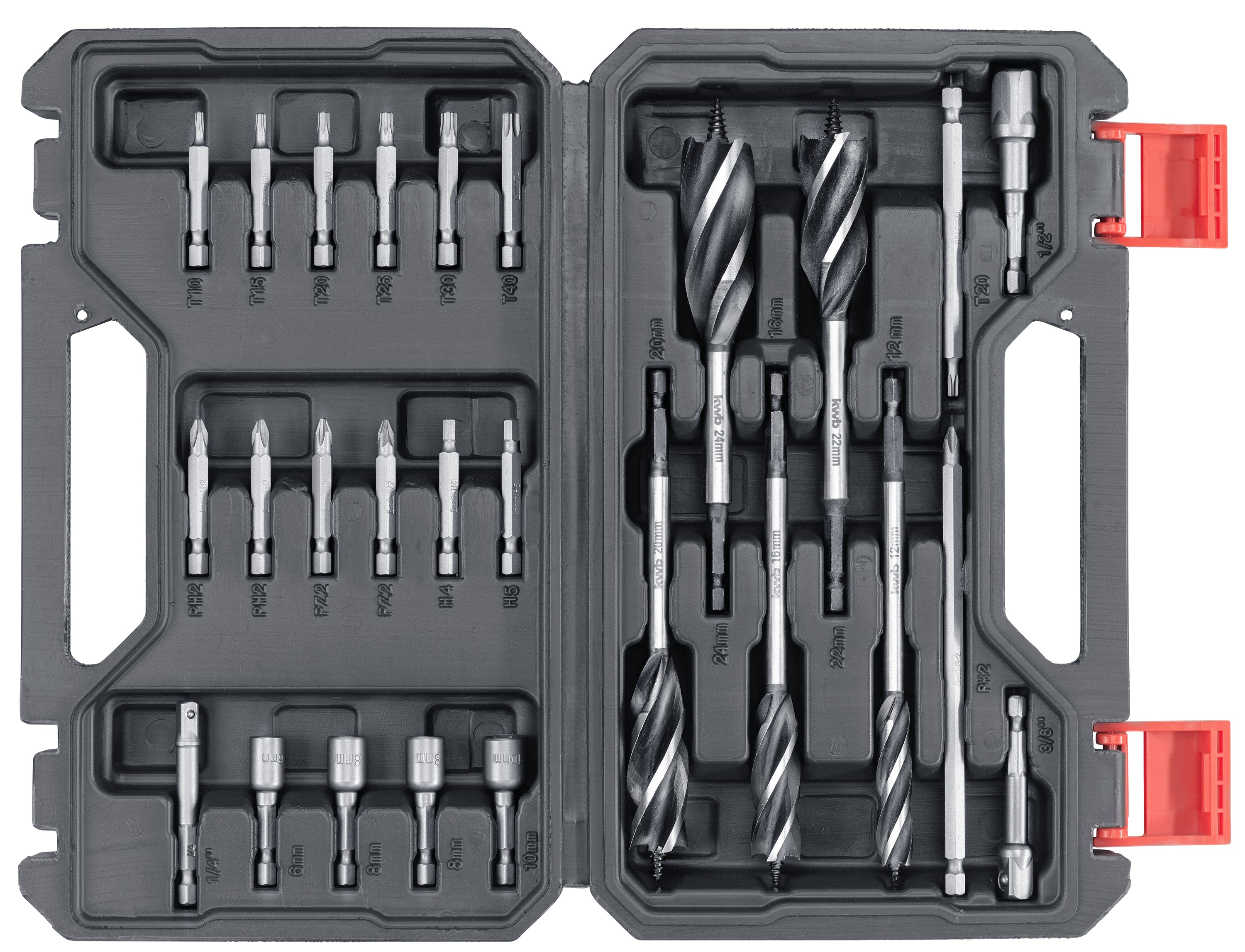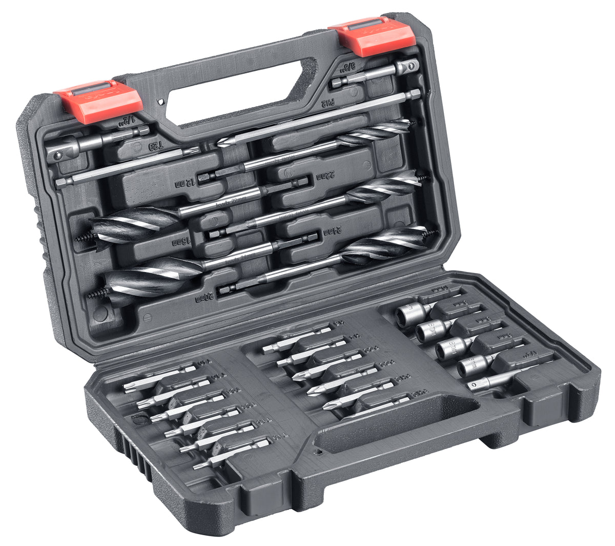 - fünf Holzbohrer (Ø 12, 16, 20, 22 und 24 mm) jeweils 165 mm lang