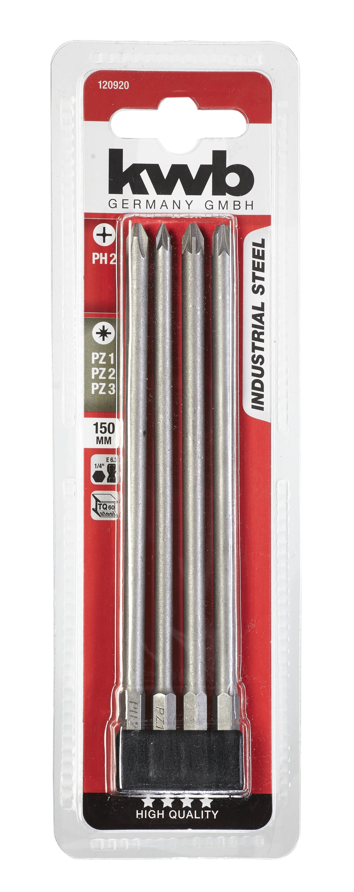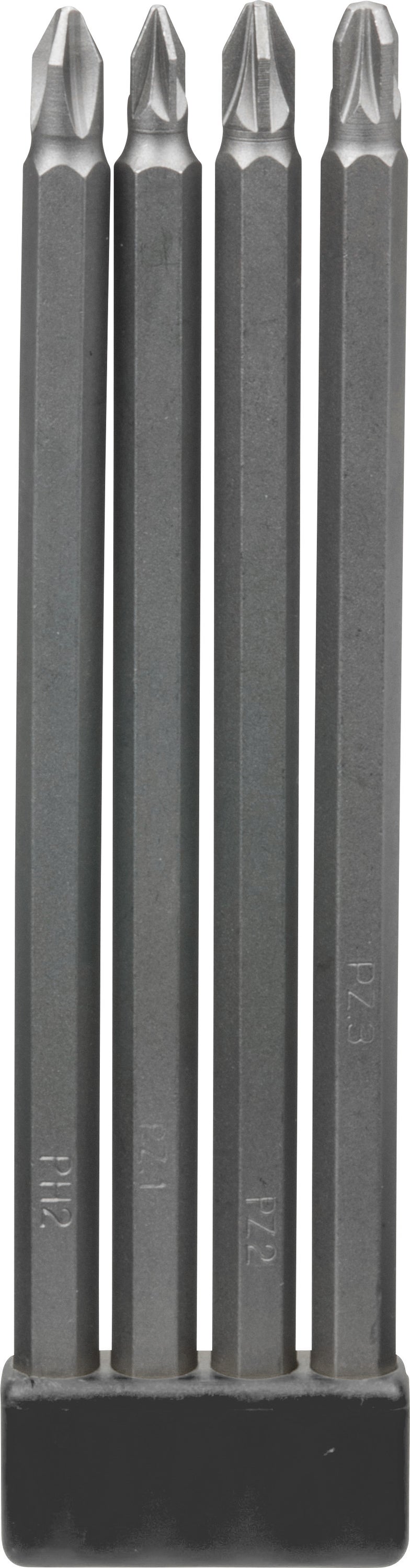 Extra lange 150 mm Bits zum Erreichen von tiefliegenden oder schwer zugänglichen Schrauben. Mit 1/4"" E 6.3 Schaft. Auf praktischem Haltestreifen. Oberfläche im Satinfinish.