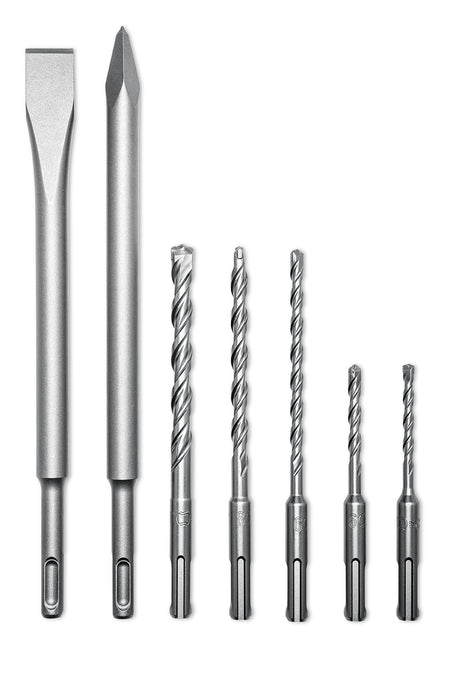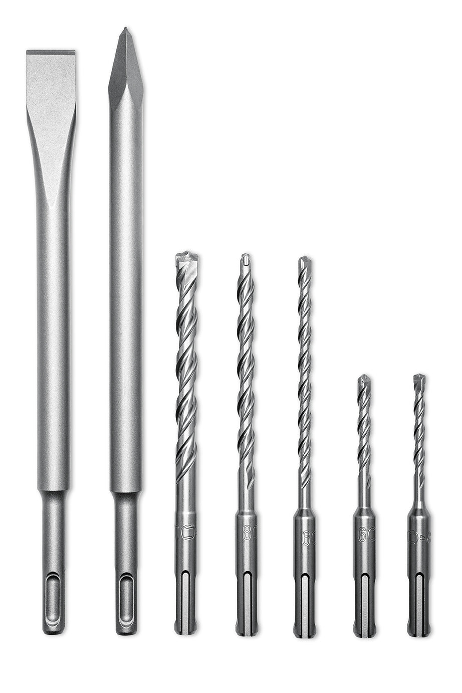 Lieferumfang: 1 Handgriff, 1 Bohrtiefenanschlag , 1 Transportkoffer L-BOXX® , 1 Koffereinlage, 1 Meißel-/Bohrerset SDS-plus (Set bestehend aus: SDS 2-plus Bohrern 1 x 5 Ø x 110 mm, 1 x 6 Ø x 110 mm, 1 x 6 Ø 160 mm, 1 x 8 Ø x 160 mm, 1 x 10 Ø x 160 mm, 1 x Spitzmeißel SDS-plus 250 mm, 1 x Flachmeißel SDS-plus 250 mm)