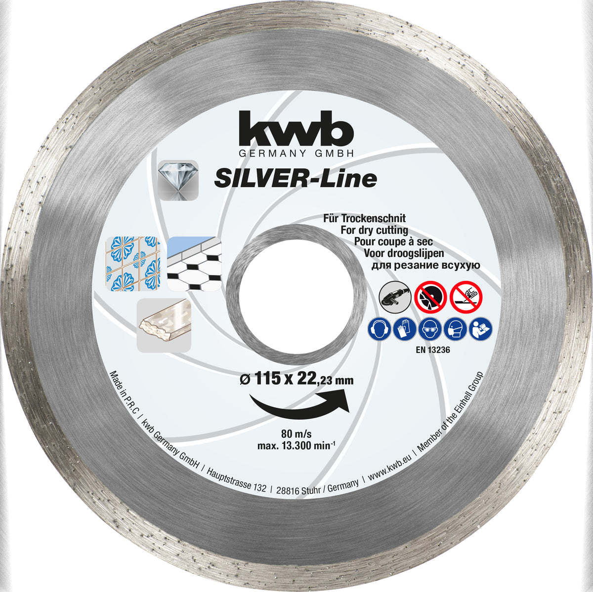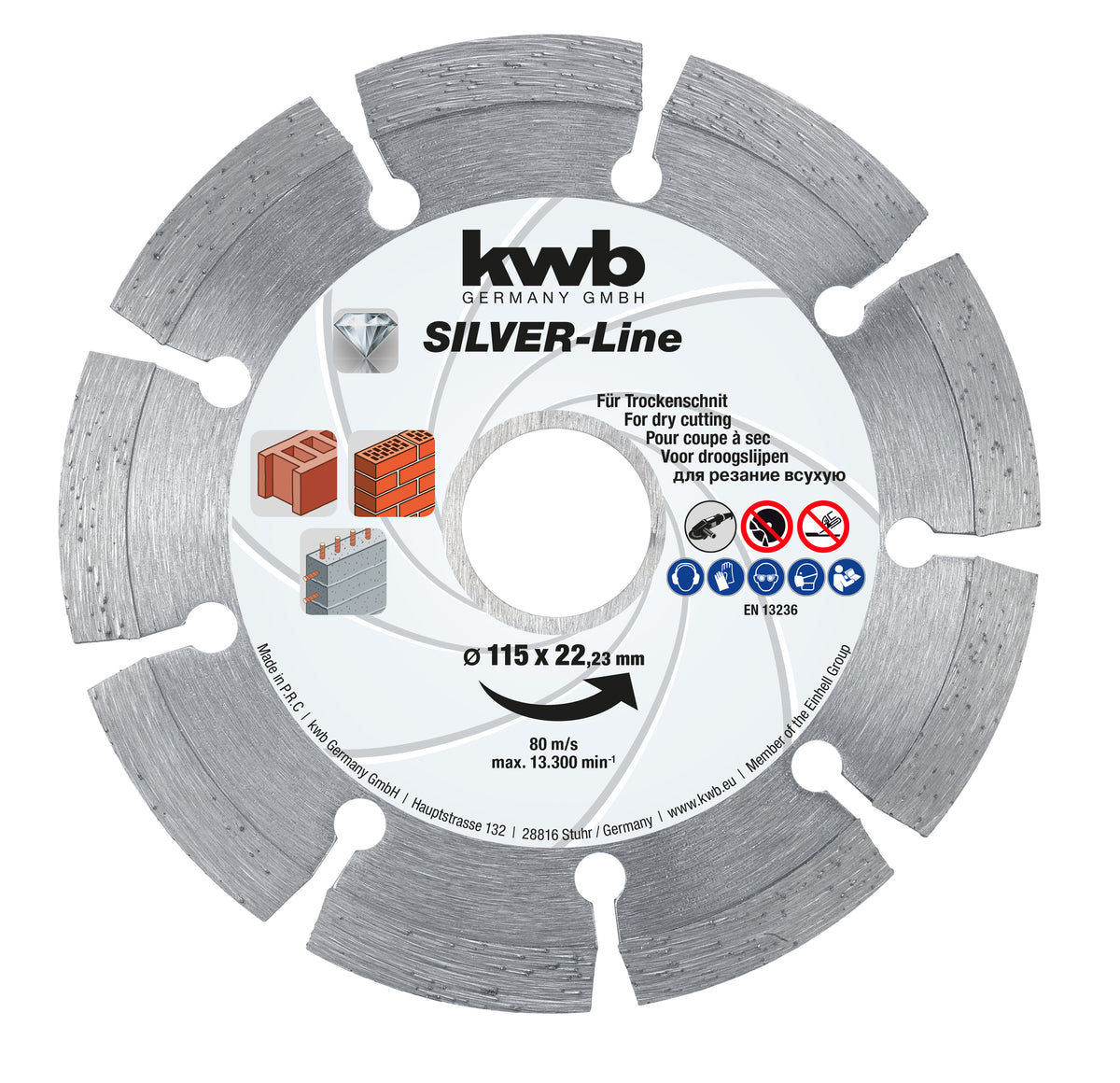 Trennscheibe der Marke kwb. Tools für deine Projekte. DIAMANT Trennscheiben, lasergeschweißt, geschlossener Schneidrand, Stärke 7 mm, für Hohlblocksteine, Dachpfannen aus Beton, keramische Werkstoffe, Fliesen, segmentierter Schneidrand, Stärke 7 mm, für Ziegelsteine, Betonsteine, Klinkersteine, geschlossener Rand, Turboform, Stärke 5 mm, für Fliesen, Keramik, Travertin, für alle handelsüblichen Winkelschleifer mit Umfangsgeschwindigkeit 80 m/s.