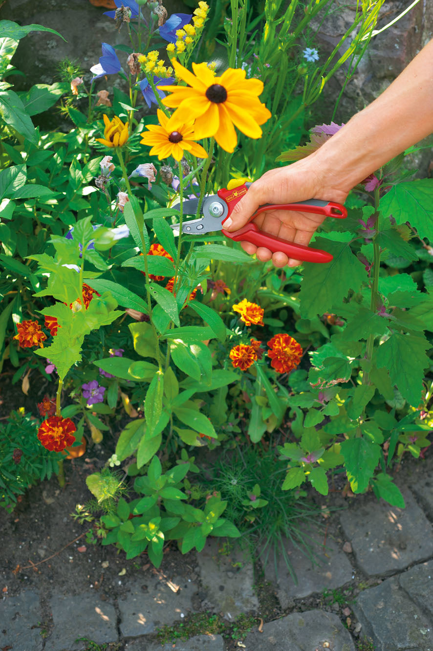 Antihaftbeschichtete Klinge. Ergonomischer Zweikomponenten-Griff mit Weichgummieinlage im Obergriff für sicheren Halt während des Schneidens. Sicherheits-Daumenablage. Gelenkschonender 30°-Schneidwinkel. Austauschbarer Amboss