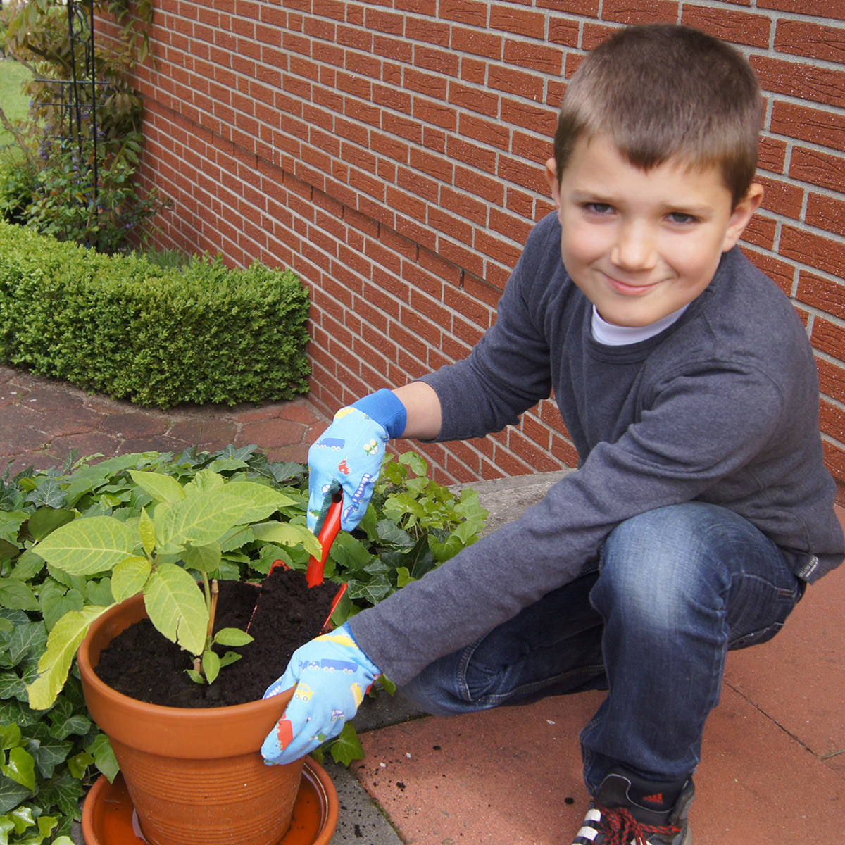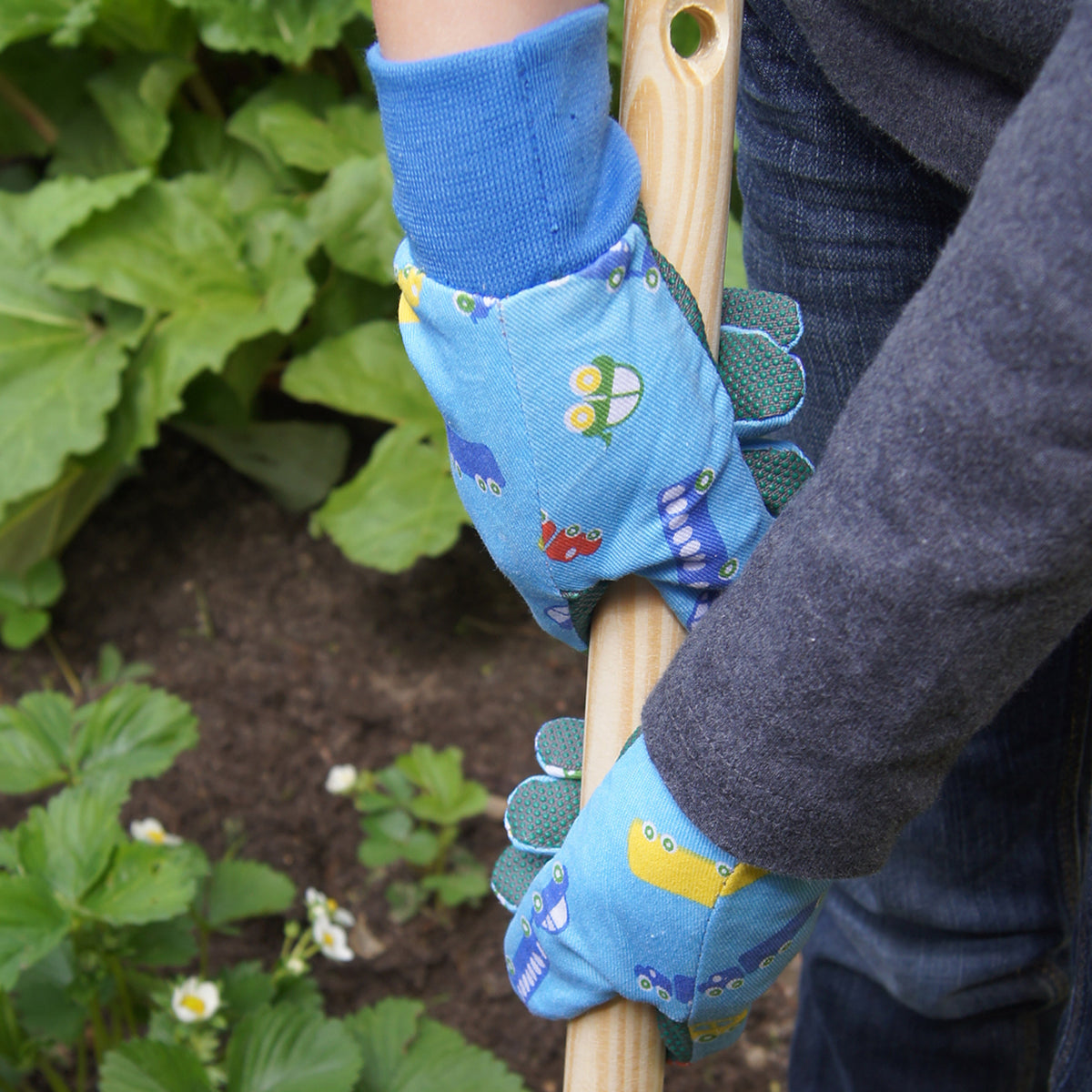 Kinderhandschuhe Garten aus Baumwolle mit flexiblem Acrylbund und rutschhemmenden PVC-Noppen auf der Handinnenfläche, mit bunten Motiven, atmungsaktiv