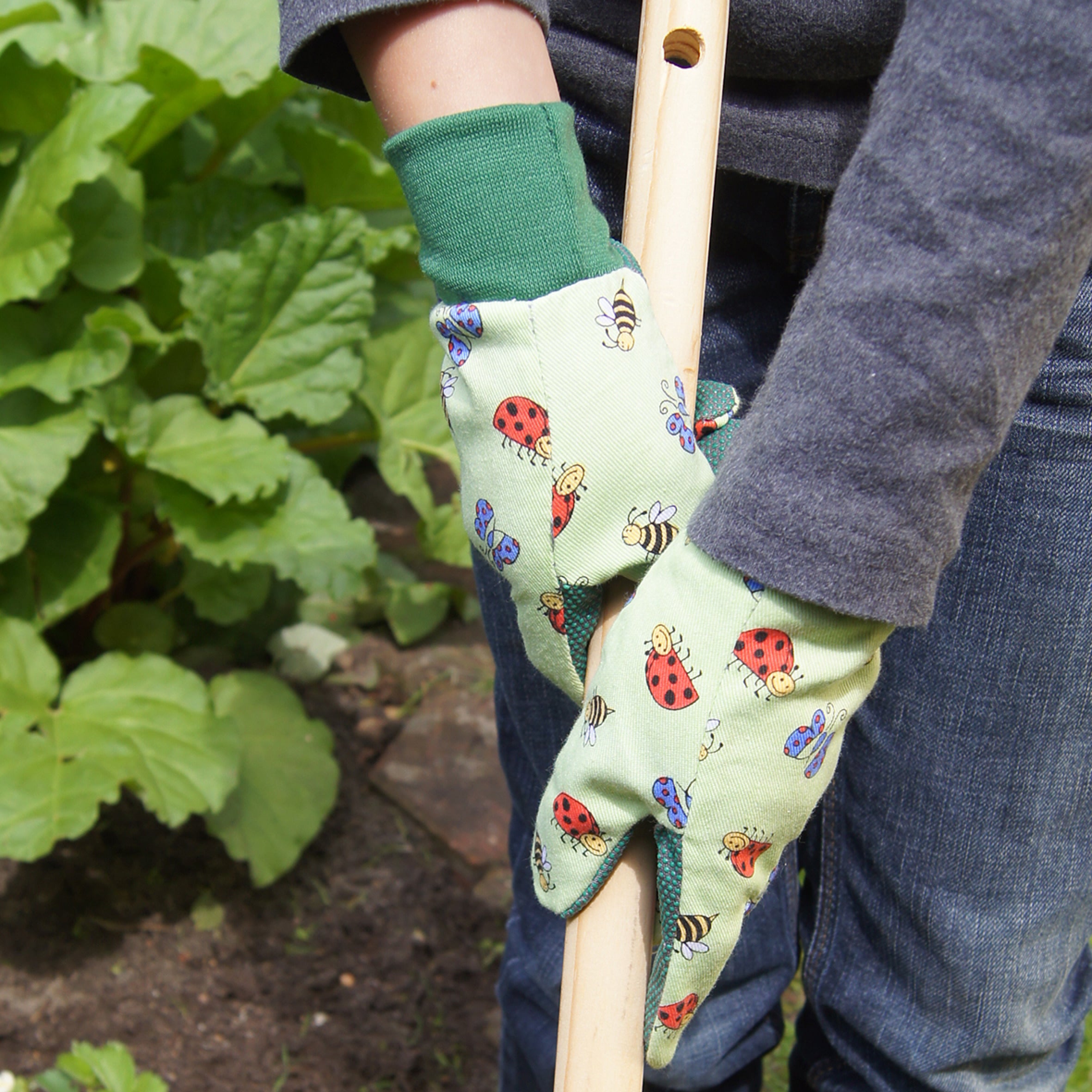 Kinderhandschuhe Garten aus Baumwolle mit flexiblem Acrylbund und rutschhemmenden PVC-Noppen auf der Handinnenfläche, mit bunten Motiven, atmungsaktiv