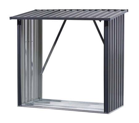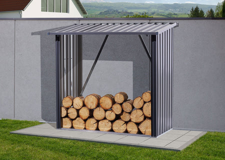 Mit den Kaminholzregal lagern und schützen Sie Ihr Spalt- und Brennholz einfach und sicher. Der Unterbau des Regals ist aus verzinkten Stahlblechprofilen. Geschützt wird das Holz vor Regenwasser mit Hilfe des Unterbaus. Die Seitenwände und die Überdachung sind aus stabilen profilierten Stahlblechen. Der Geräteraum hat eine Flügeltür, die sowohl mit einem Kunststoff-Griff wie auch einem Tür-Riegel ausgestattet ist. Bei Bedarf ist der Geräteraum abschließbar (ein Vorhängeschloss ist im Lieferumfang nicht enthalten )