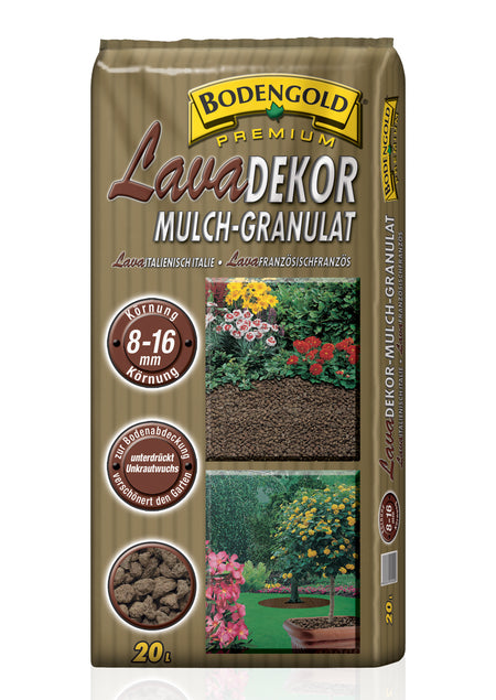 Eine 2-4 cm dicke Schicht dieses vulkanischen Gesteins in der Körnung 8-16 mm verbessert den Sauerstoff- und Wasserhaushalt des darunter geschützten Mutterbodens entscheidend und trägt somit zu einem gesunden Pflanzenwachstum bei. Gleichzeitig unterdrückt sie den Unkrautwuchs auf natürliche Weise. Mit Bodengold Premium Lava-Dekor Mulch-Granulat lassen sich auch Blumenbeete und Wege interessant gestalten. Das Material ist langlebig, geruchsneutral und verrottet nicht. Der Pflegeaufwand wird langfristig reduziert und die gemulchten Flächen bleiben dauerhaft schön.