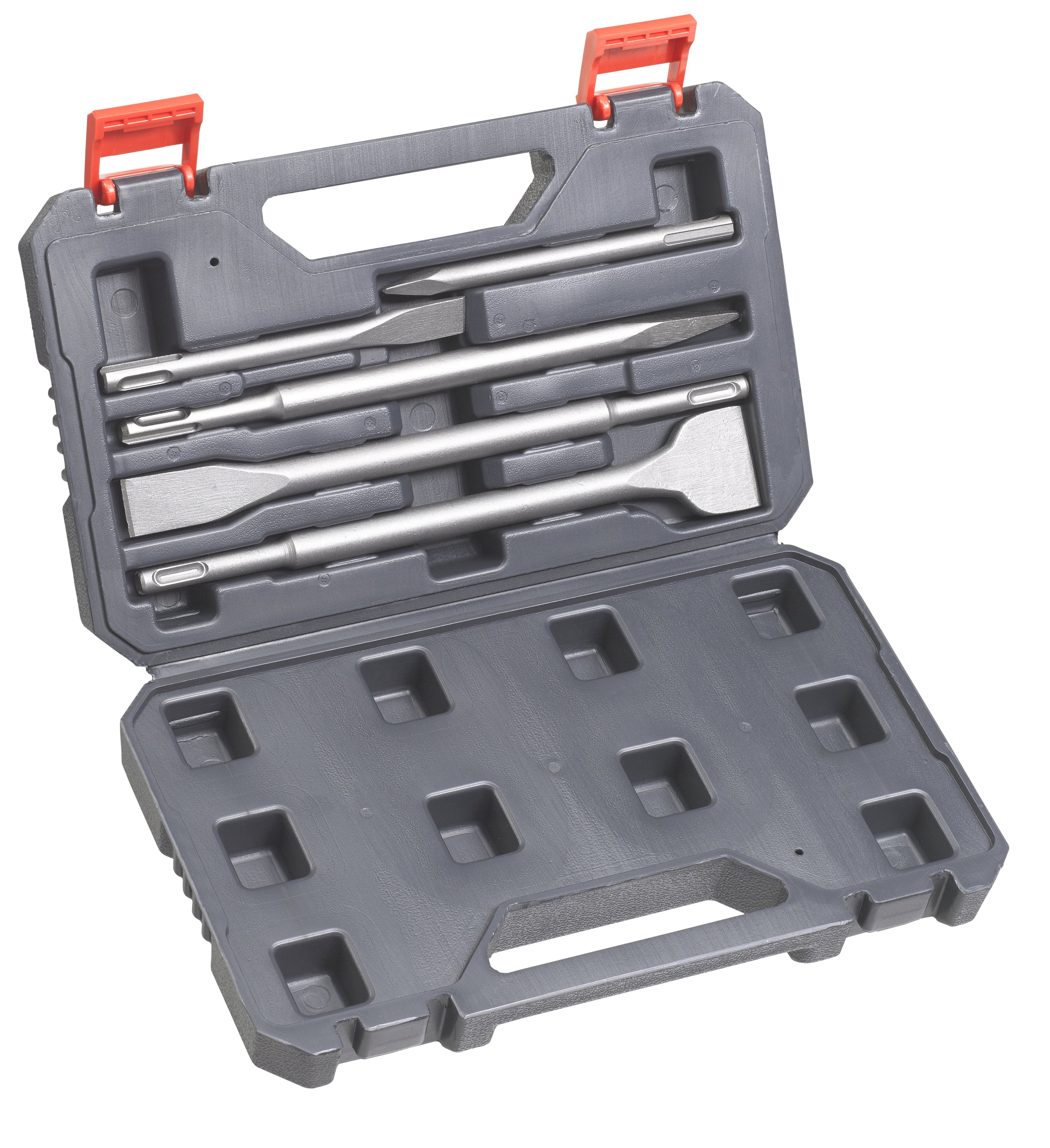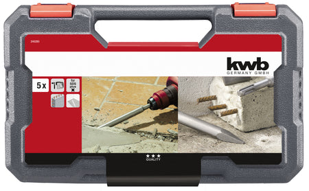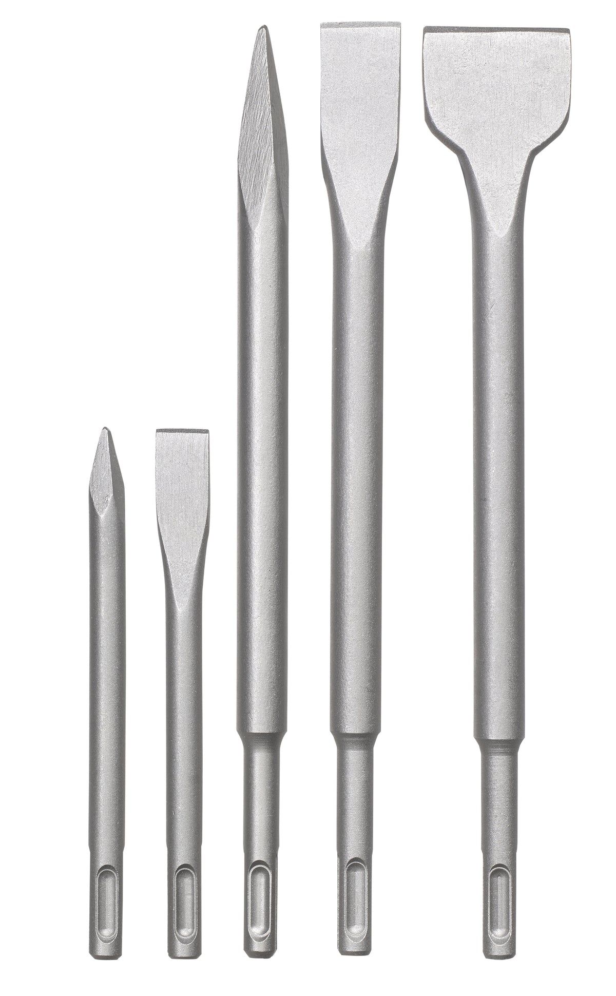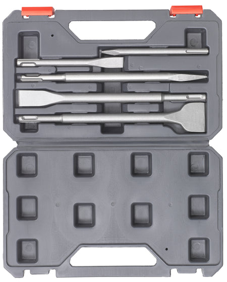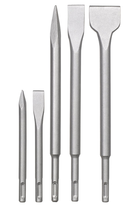SDS Plus Meißelsatz 5-tlg., Starterset für den Bohrhammer mit den gängigsten Größen, geeignet für alle Abbruch- und Renovierungsarbeiten, enthält 2 Spitzmeißel in den Längen 140 und 250 mm und 3 Flachmeißel mit den Maßen 10 x 140 mm, 20 x 250 mm und 40 x 250 mm, robuster CR-Stahl mit einer Härte von HRC 50+3, mit SDS-Plus-Schaft passend für alle Bohrhämmer mit Dreh-Stopp und SDS-Plus-Aufnahme, im praktischen Aufbewahrungskoffer.