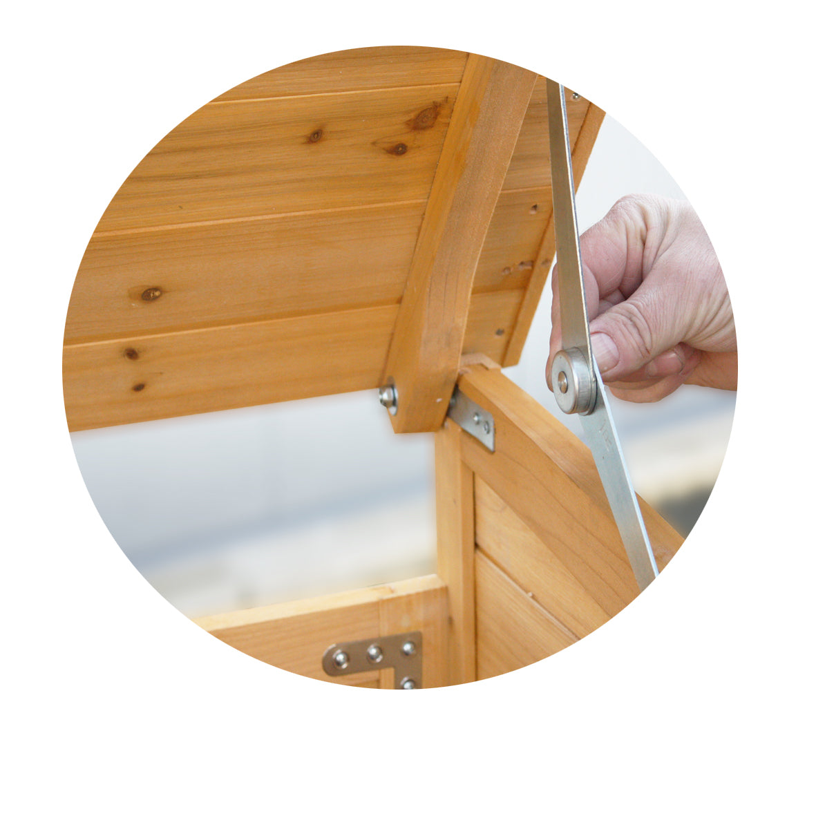 Wenn einmal längerer Zugang zur Mülltonne notwendig wird, kann der Deckel der Mülltonnenbox mittels Metallscharnier festgestellt werden. So liegt der Deckel der Mülltonne dauerhaft offen und Sie haben beide Hände frei.