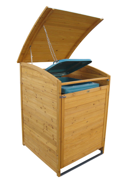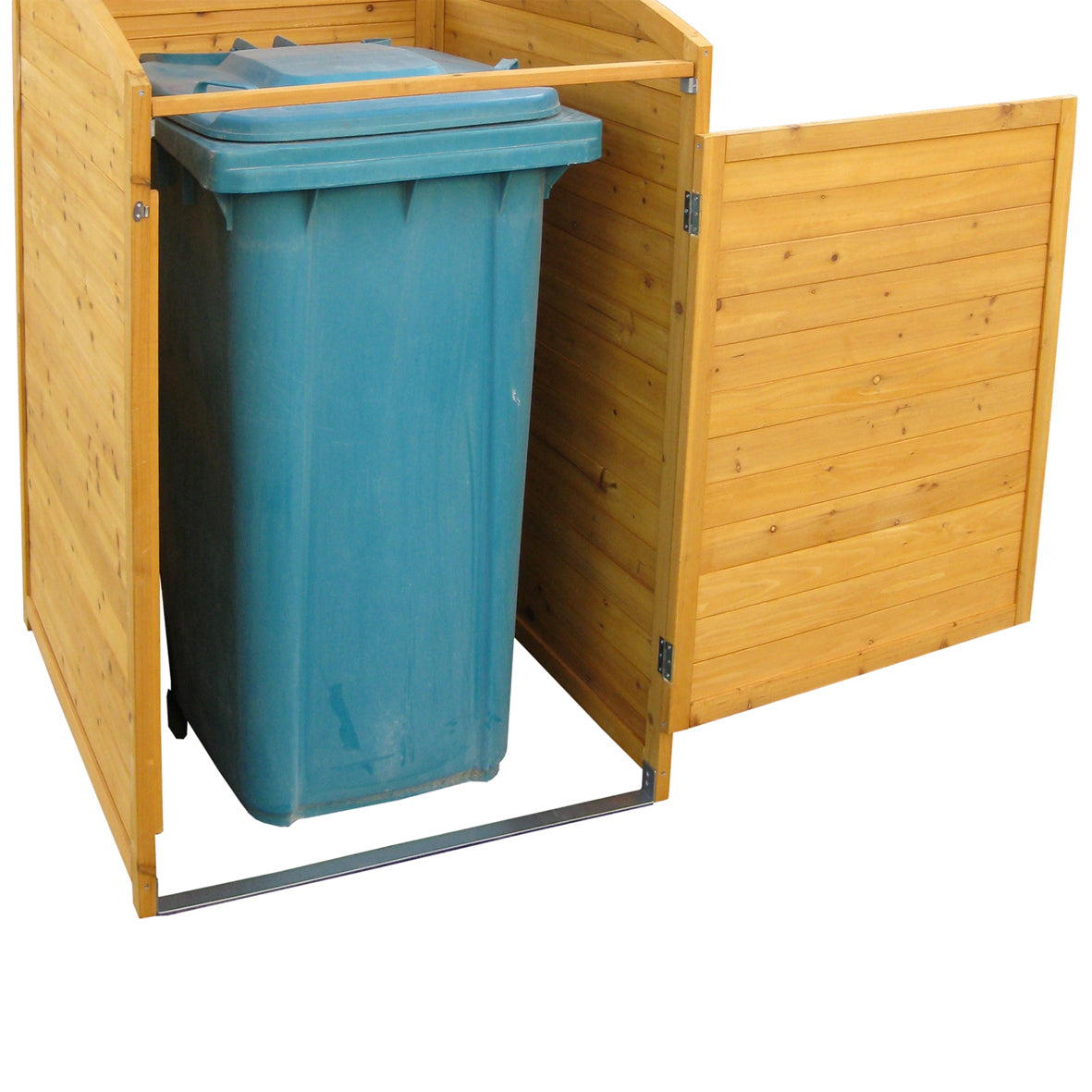 Die Mülltonnenbox von HABAU kann zur ansprechenden Verkleidung sämtlicher Mülltonnen von 120 Liter bis 240 Liter Fassungsvermögen eingesetzt werden. So verschwinden Ihre Mülltonnen hinter einer schönen Holzfassade! Die Maße sind speziell für Mülltonnen mit 120 Liter und 240 Litern Fassungsvermögen ausgerichtet. Die Verkleidung besteht vollständig aus Holz, zudem ist das Dach verzinkt, um besondere Langlebigkeit zu gewährleisten. Das Wasser kann über das geneigte Zinkdach abfließen, ohne direkt ins Holz einzudringen. Die Metallschiene am Boden sorgt für zusätzliche Stabilität der gesamten Verkleidung. Die Verkleidung ist so auch bei seitlichem Wind sehr stabil. Über die Schiene kann die Mülltonnenbox auch mit dem Boden verankert werden.