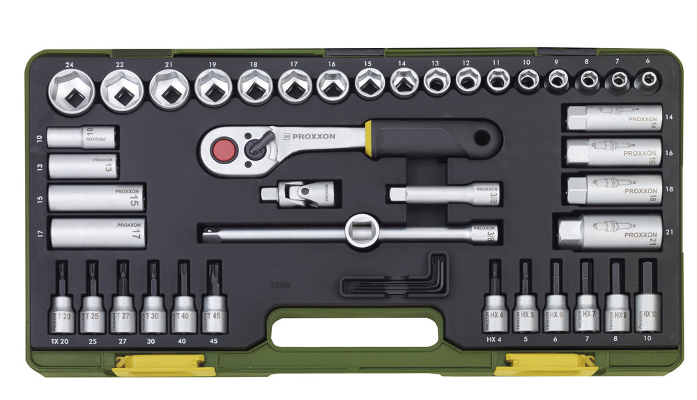 Set Bestehend Aus: 3/8 Umschaltratsche, Steckschlüsseleinsätze: 6 / 7 / 8 / 9 / 10 / 11 / 12 / 13 / 14 / 15 / 16 / 17 / 18 / 19 / 21 / 22 / 24 mm, Tiefbetteinsätze für weit überstehende Gewindebolzen: 10 / 13 / 15 / 17 mm, Zündkerzen-Spezialeinsätze: 14 / 16 / 18 / 21 mm, Schraubereinsätze Innensechskant HX: 4 / 5 / 6 / 7 / 8 / 10 mm, Schraubereinsätze TX: 20 / 25 / 27 / 30 / 40 / 45, 2x Verlängerung, Kreuzgelenk, Innensechskantschlüssel: 1,25 / 1,5 / 2 / 2,5 / 3 mm