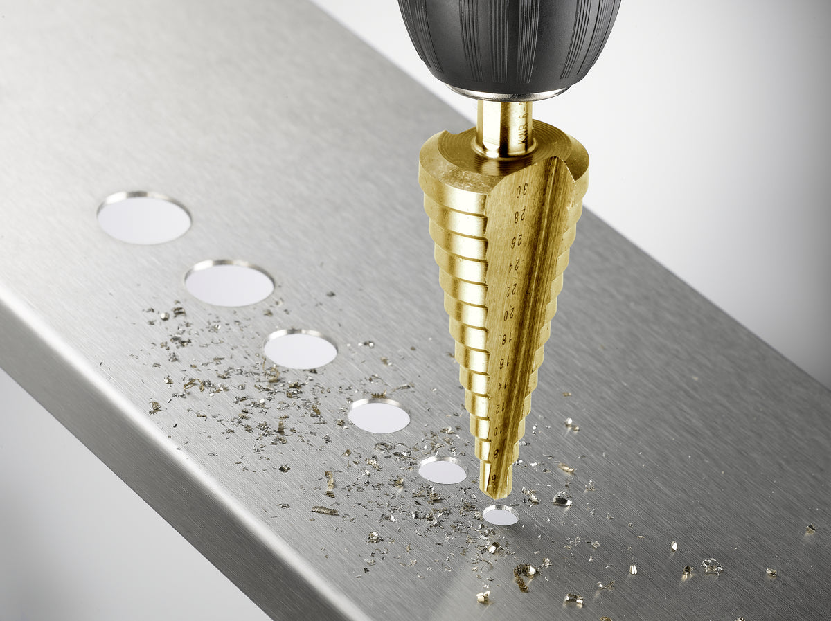 2 Stufenbohrer in den Abmessungen 4 – 12 mm und 4 – 30 mm und 1 Fräsbohrer Ø 6 mm in Profi-Qualität; Stufenbohrer: abgestuft in den gängigsten Bohrdurchmessern, mit Anbohrspitze, zum Bohren kleiner bis großer Durchmessern ohne Vorbohren selbst in dünnste Bleche, gratfrei durch Kantenbrecher; Fräsbohrer: zum Bohren und Fräsen, für die Herstellung von Langlöchern und zum Aufweiten von Bohrungen, alle Bohrer des Sets aus HSS-Stahl, titan-nitrierte Oberfläche, für Stahlbleche, Nicht-Eisenmetalle und Kunststoffe, in Blisteraufbewahrungstasche.