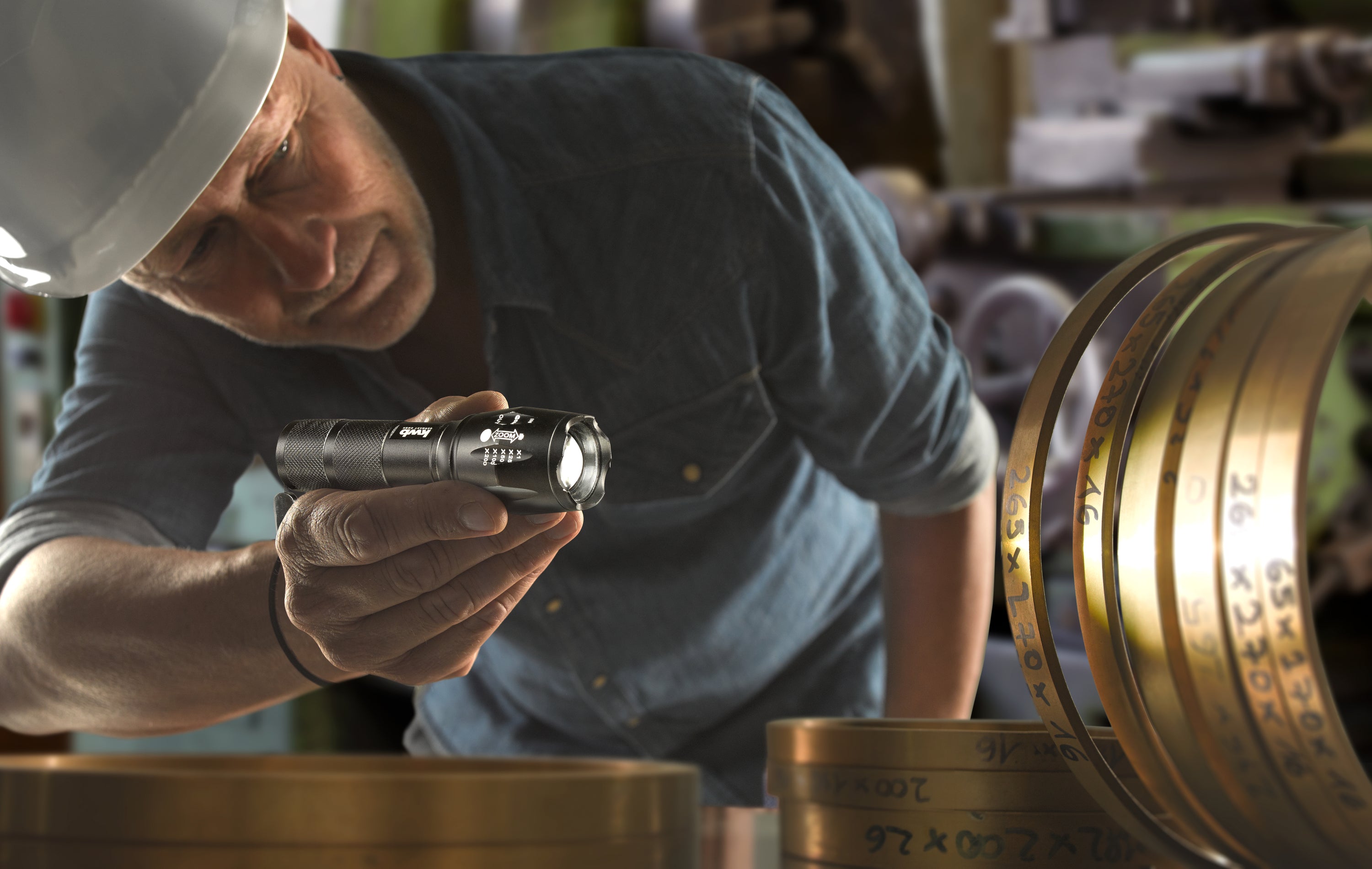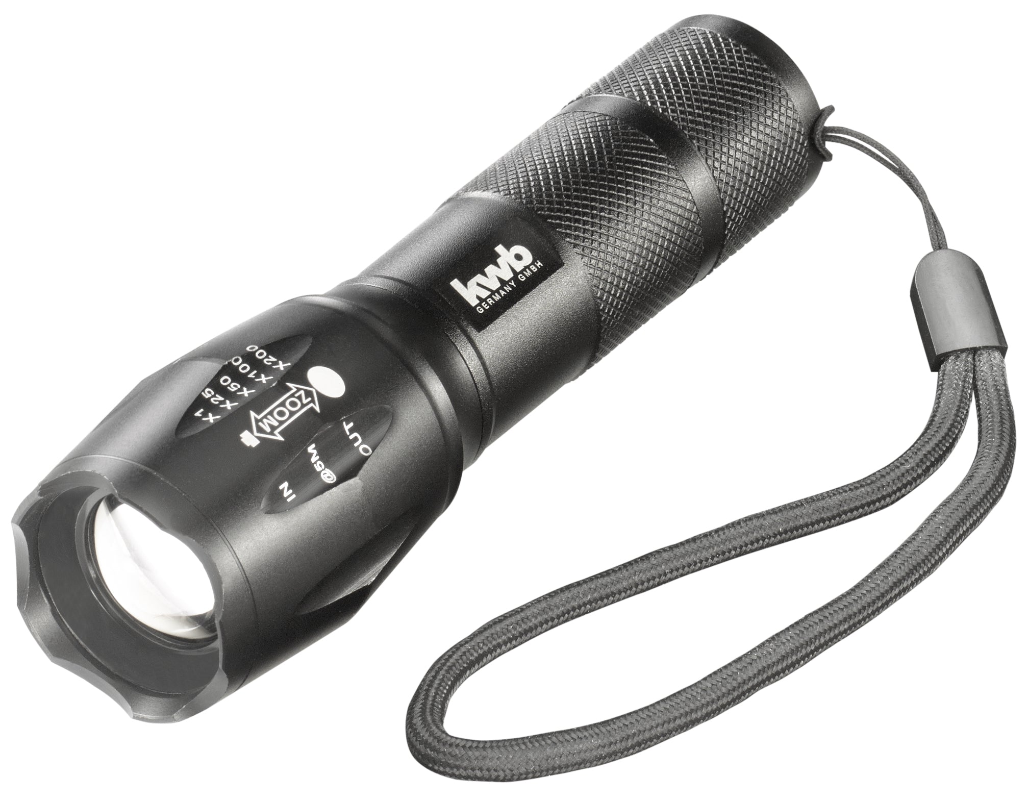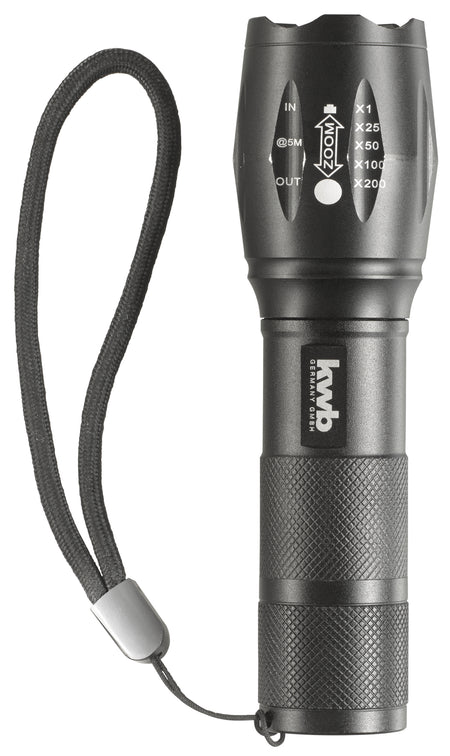 Die kwb LED-Taschenlampe mit Blitzlicht und SOS-Blinklicht ist überall nutzbar. Fünf Lichtmodi mit bis zu 282 Lumen Lichtstrom sorgen für angepasstes Licht je nach Arbeitsumfeld. Für helles Flächenlicht oder Punktbeleuchtung ohne Hotspot-Bildung verfügt die kwb LED-Taschenlampe über eine stufenlose Zoom-Funktion. Das Leuchtmittel ist nach ANSI-FL-Standard geprüft. Drei 1,5-V-AAA-Batterien sorgen für die ausreichende Spannungsversorgung (im Lieferumfang). Das Gehäuse besteht aus stoßfestem Aluminium und übersteht Stürze aus 1 Meter Höhe. Ein Schlaufe aus robuster Nylonschnur lässt sich um das Handgelenk legen oder auch zum Aufhängen nutzen.