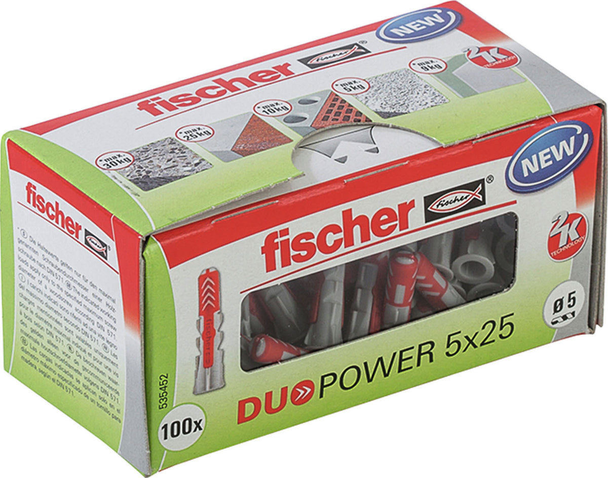 Der fischer DUOPOWER bietet sehr gute Haltewerte durch 2 Komponenten: Die graue Komponente aus hochwertigem Nylon aktiviert je nach Baustoff automatisch das optimale Funktionsprinzip (Spreizen, Klappen, Knoten) für besten Halt. Die Expansionsflügel der roten Komponente unterstützen die sichere Verspreizung und bieten zusätzliche Sicherheit zur grauen Komponente. Einfaches Eindrehen der Schraube und richtiges „Ziehen“ zum Schluss. Kein Überdrehen der Schraube. Der am Dübelkopf angeformten Rand verhindert, dass der Dübel ins Bohrloch rutscht. Die mitgelieferten Schrauben sind optimal auf den fischer Spreizdübel Duopower abgestimmt.
