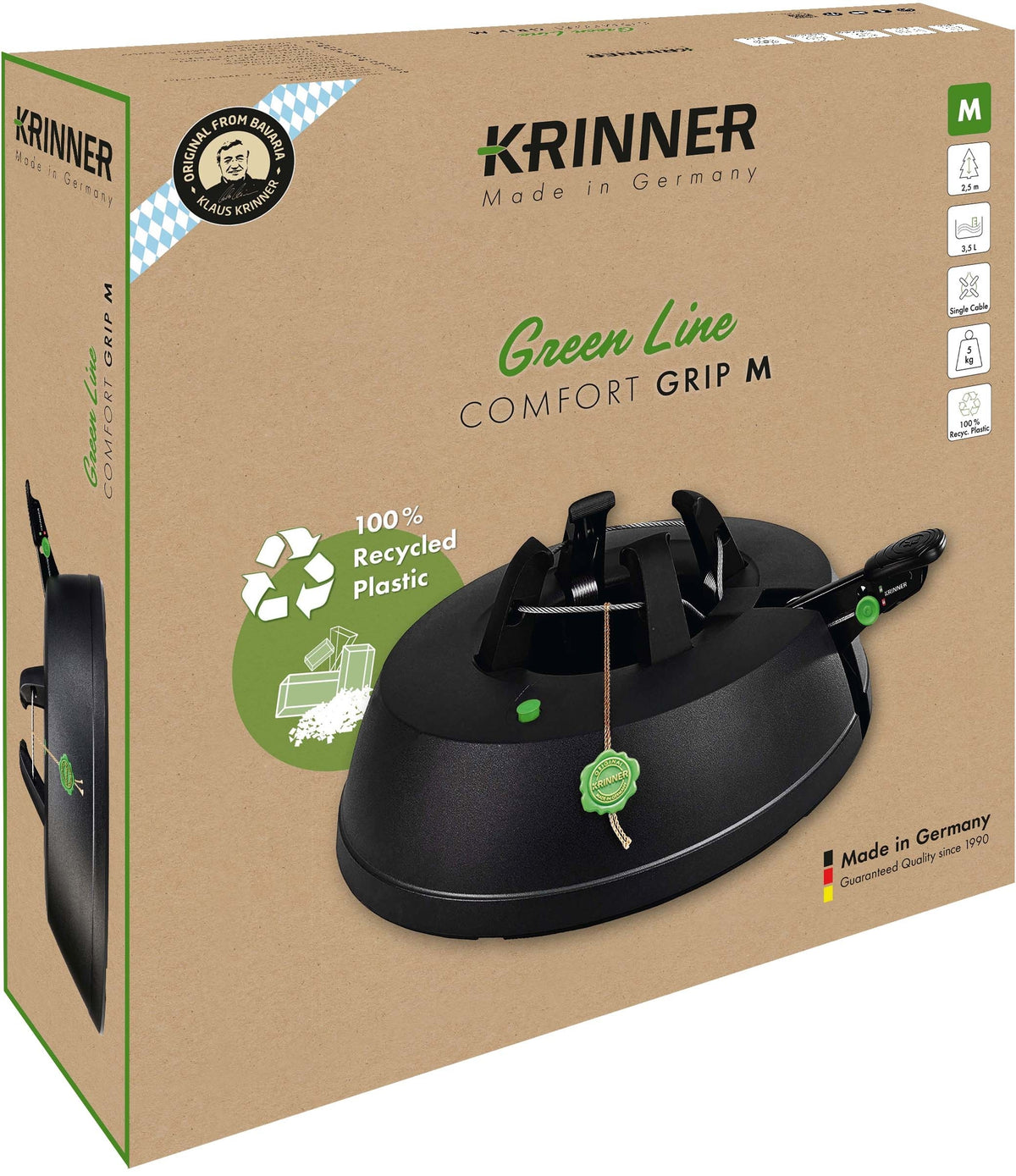 Der neue KRINNER Green Line Comfort Grip M wird nachhaltig und ressourcenschonend in Niederbayern hergestellt und trägt damit aktiv zum verantwortungsvollen Umgang mit unserer Umwelt bei. Der KRINNER Green Line Comfort Grip M spiegelt damit unsere Überzeugung zu nachhaltigem Handeln und einer besseren Zukunft wieder. „Auf unsere Qualität Made in Germany sind wir stolz und für unsere Kunden ist dies ein ausschlaggebendes Marken-Qualitätsmerkmal. Die deutlich kurzen Transportwege durch unsere Produktion in Niederbayern verbessern zusätzlich die Ökobilanz“, so Klaus Krinner. KRINNER plant 2020 die Verarbeitung von über 200 Tonnen (!) Recycling Material. Dies entspricht rund 10 Millionen Plastikflaschen. Der Krinner Green Linke Comfort Grip M ist ausgestattet mit der original Rundum-Einseil-Technik. Die durchgehende Seilführung garantiert dabei den gleichmäßigen Druck der Klauen an den Stamm. Einfach den Baum in den Ständer stellen, das Fußpedal treten, fertig! Ob dick, dünn oder krumm gewachsen, der Baum steht sicher und kerzengerade. Zudem sorgt der patentierte Sicherheitsgurt durch seine schrittweise öffnende Mechanik für extra Sicherheit und verhindert ungewolltes Kippen.