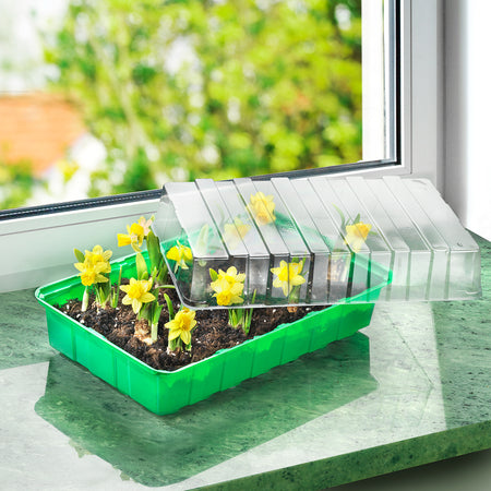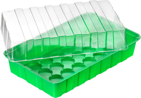 Wasserdichte Wanne und glasklare Abdeckhaube aus Kunststoff, Vertiefungen im Schalenboden zur Fixierung und gleichmäßigen Wasserversorgung der Torfquelltöpfe, durch die Erwärmung zwischen Wanne und Deckel verdunstet Wasser, ideale Bedingung zur Jungpflanzenanzucht durch Treibhauseffekt